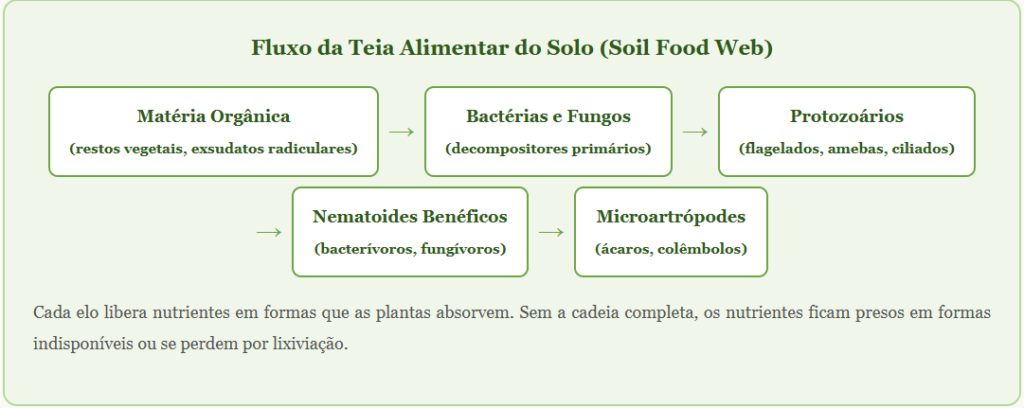 Para compreender o que se perdeu, precisamos entender o que deveria estar presente. A teia alimentar do solo, conceito sistematizado pela Dra. Ingham ao longo de três décadas, descreve uma rede trófica complexa que funciona embaixo dos nossos pés com lógica elegante e implacável.