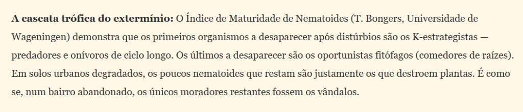 Este artigo não vai explicar o que é compostagem nem definir sustentabilidade. Ele vai mergulhar nas camadas profundas do solo urbano para revelar por que o jardim bonito do seu prédio pode ser um paciente terminal, como diagnosticar esse quadro, e o que acontece quando protozoários flagelados, amebas e nematoides bacterívoros são reintroduzidos num substrato que os perdeu há décadas.