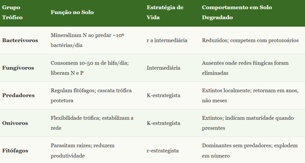 | Nematoides benéficos | Amplificação da ciclagem; regulação microbiana | 5 a 500 | 0 a 2 (predominam fitófagos) | Explosão de patógenos radiculares |