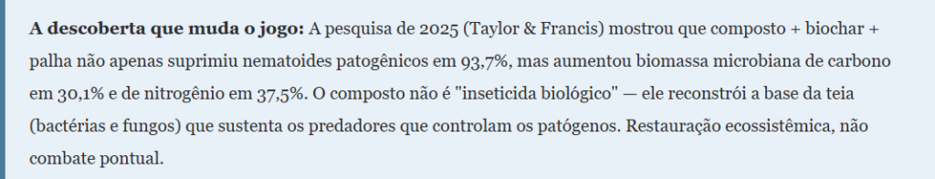 A pesquisa publicada na Frontiers in Ecology and Evolution em 2025 (Pan et al.) confirma o que observadores de solo urbano documentam há anos: a urbanização simplifica drasticamente as comunidades de nematoides, reduzindo a estabilidade ecossistêmica ao ponto de comprometer os ciclos de nutrientes. Outro estudo, publicado na Taylor & Francis (2025), demonstrou que a combinação de composto, palha e biochar reduziu em 93,7% a incidência de nematoides patogênicos, enquanto aumentava a biomassa microbiana de carbono e nitrogênio em mais de 30%.