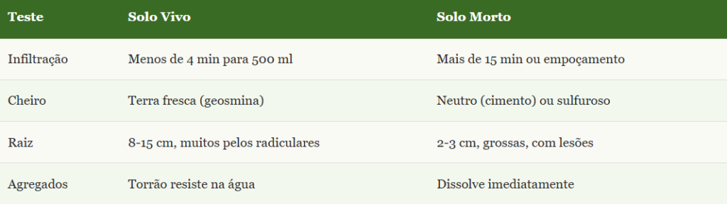 Teste da infiltração: crave um tubo de PVC de 10 cm no solo (5 cm de profundidade). Despeje 500 ml de água. Solo com biologia ativa absorve em menos de 4 minutos. Solo morto e compactado leva mais de 15 ou simplesmente empoça.