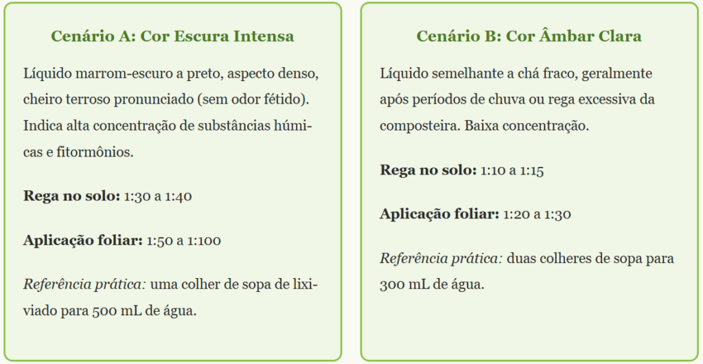Um estudo publicado na SciELO Brasil avaliou doses de ácido húmico extraído de vermicomposto (0, 2, 20, 40 e 200 mg/L) e confirmou que concentrações intermediárias (20 a 40 mg/L) foram as mais eficazes para o crescimento vegetal, enquanto a dose de 200 mg/L apresentou efeitos fitotóxicos. A implicação direta para quem usa o lixiviado em casa: mais concentrado não é melhor.