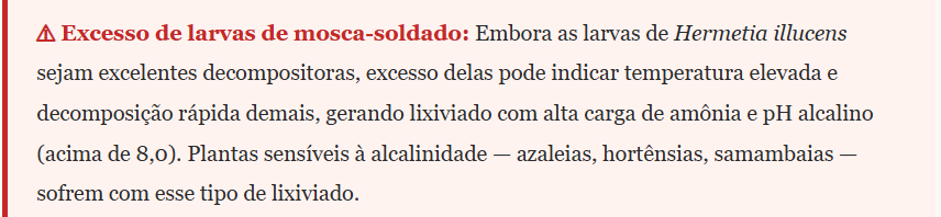 Em ambientes urbanos, é comum que restos de comida processada (com alto teor de sódio) entrem na composteira. Com o tempo, o sódio se acumula no lixiviado. Plantas cultivadas em vasos são especialmente vulneráveis ao acúmulo de sais, que reduz a capacidade de absorção de água pelas raízes (estresse osmótico). Se suas plantas apresentam bordas de folhas queimadas mesmo com rega adequada, o excesso de sal no lixiviado pode ser o responsável.