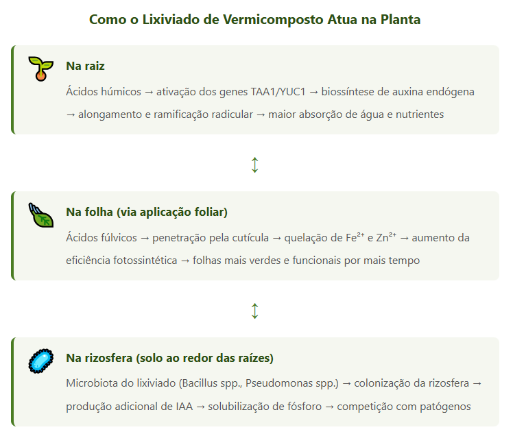 Quando você dilui e aplica o lixiviado da sua vermicomposteira, está entregando às plantas não apenas nutrientes minerais, mas um pacote biológico completo: hormônios vegetais em concentração fisiológica, substâncias húmicas com atividade comprovada de quelação de micronutrientes (especialmente ferro, zinco e manganês), e microrganismos vivos capazes de colonizar a rizosfera e a filosfera, estabelecendo relações de proteção contra patógenos.