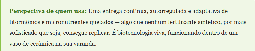 Assim como o sangue de dragão vegetal, o lixiviado é um concentrado cuja potência reside na complexidade da mistura, não em um ingrediente isolado. Um biofertilizante comercial pode conter ácido húmico purificado. Mas o lixiviado de uma composteira ativa contém ácido húmico, ácido fúlvico, aminoácidos livres (incluindo triptofano, precursor direto da auxina IAA), enzimas extracelulares, sideróforos bacterianos (moléculas que capturam ferro do ambiente) e uma comunidade microbiana diversa que funciona como fábrica contínua de compostos bioestimulantes.