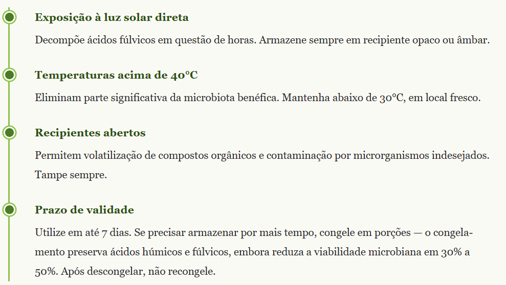 O lixiviado de vermicomposto é um produto vivo. Suas propriedades bioestimulantes dependem da integridade das substâncias húmicas e da viabilidade dos microrganismos presentes. Armazenamento inadequado degrada ambos.