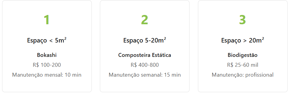 | Valor agregado | R$ 0 | R$ 30-50 (composto) | R$ 80-120 (composto + biogás) |
