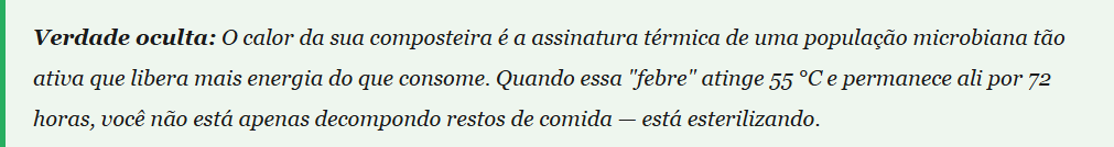 A febre do composto é a cura do resíduo. E aprender a ler essa febre, provocá-la, sustentá-la e interpretá-la, é a habilidade técnica que separa o compostador amador do regenerador urbano consciente.