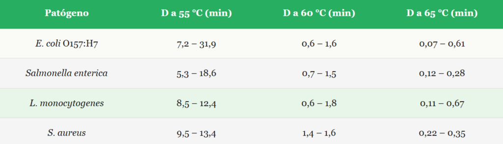 A 60 °C, o cenário muda radicalmente: mesmo o valor-D mais desfavorável cai para 1,8 minutos (Listeria). Uma redução de 5-log exigiria apenas 9 minutos. E a 65 °C, falamos em segundos para a maioria dos organismos. Cada grau acima de 55 °C encurta exponencialmente o tempo necessário, o chamado valor-z (entre 4,3 °C e 7,3 °C para esses patógenos) garante que um aumento de apenas 5 °C reduz o valor-D por um fator de aproximadamente 10.
