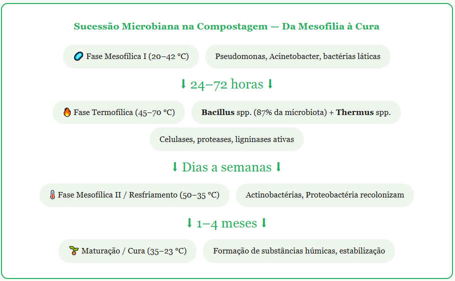 A compostagem não é um evento estático. É uma sucessão ecológica em que populações microbianas se revezam conforme a temperatura muda e são exatamente as transições entre essas populações que determinam se o composto final será seguro ou um risco sanitário disfarçado de adubo.