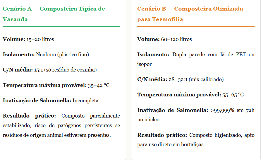 Chegamos ao cerne do problema que este artigo se propõe a resolver. A imensa maioria das composteiras domésticas comercializadas no Brasil e as improvisadas com baldes, caixas e latas, operam na faixa mesofílica. Atingem 35–45 °C nos melhores dias e jamais cruzam a linha dos 55 °C. A compostagem ainda acontece, a matéria orgânica é degradada, minhocas fazem sua parte. Mas a inativação térmica de patógenos não se completa.