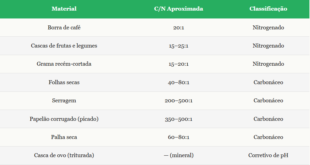 Tabela 2 – guia de relação C/N para materiais comuns de compostagem doméstica