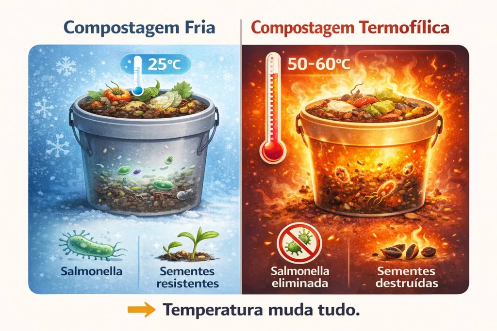 A falta de calor também permite a sobrevivência de patógenos. Se você usa o adubo de um balde que nunca esquentou em uma horta de consumo imediato (como alface), o risco de contaminação cruzada é real. Por isso, a fase termofílica não é apenas para “ir rápido”, é para garantir que o seu “lixo” se transformou, de fato, em um insumo seguro para a vida.