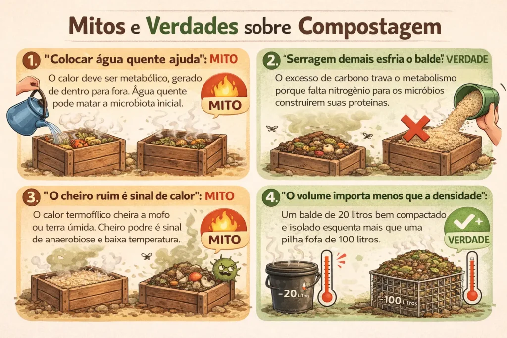 Muitos usuários de sistemas anaeróbios (Bokashi) confundem os conceitos. No Bokashi, não buscamos o calor, mas a fermentação láctica. No entanto, se o seu objetivo é a compostagem tradicional em baldes furados, a ausência de calor é um erro de processo.