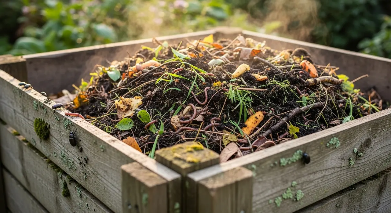 Você está em casa quando sente aquele cheiro acre vindo do balcão. A temperatura marcou 32 °C pela terceira vez esta semana. Abre a tampa do seu balde de compostagem e encontra uma superfície preta, brilhante de umidade — o sinal clássico de uma anaerobiose acelerada por calor.